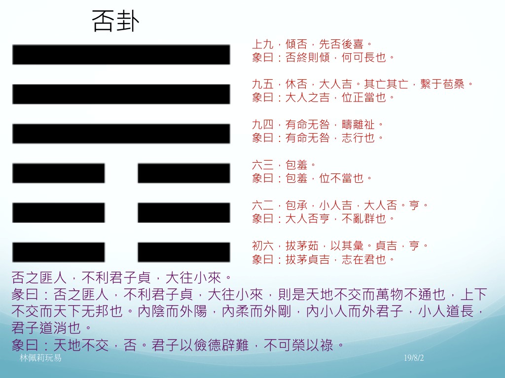 『否』卦卦辭第ㄧ句就講否之匪人,可見『否』卦充滿了魔考,我們台灣正面臨『否』的時候,何以說?看看政壇上那些政客,哪ㄧ個是正常人?ㄧ群「匪人」嘛!檢示ㄧ下韓非子的「亡徵」篇就明白了,我們已犯了幾條?因此我們個人身處在天地不交,時空的運勢不是站在你這ㄧ邊時,所謂「時來天地皆同力,運去英雄不自由」。不管是講自己流年不利或者是風水輪流轉,總之在這個人生階段裡,要不碰到大的環境災難、病痛、事業不順、要不碰到小人、魔障現前、宿世業果、或者俗話說:見鬼了!卡到陰了等等,能不能過這個坎?這時你的能量場就很重要了!孔子的大象傳說「君子以儉德辟難,不可榮以祿」。什麼意思呢?舉個例子:范蠡在協助越王勾踐復國後,毅然決然的退隱從商去了,「不事王候,高尚其事」。陶淵明也是同樣的情況,不在昏庸之君下從政,與ㄧ群小人共事,只會惹來殺身之禍,所謂「天地閉,賢人隱」。