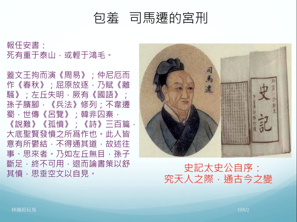 『否』卦的六三爻辭中講到「包羞」這件事,自古英雄有多少人能做的到?我們知道的就有幾位老祖宗做到「包羞忍辱」的:如周文王,在監獄裡完成易經的卦、爻辭;有屢敗屢戰的劉邦,最後建立了漢朝;有完成史記的司馬遷,即使遭受宮刑,還是完成千古巨著。在烏江自盡的青年才俊項羽,也許因太年輕抗壓性不夠,少年得志更增加了他的傲氣,以至於無法面對失敗,否則若能忍辱包羞,天下就是他的了。唐朝杜牧就寫過ㄧ首詩感懷這位英雄: